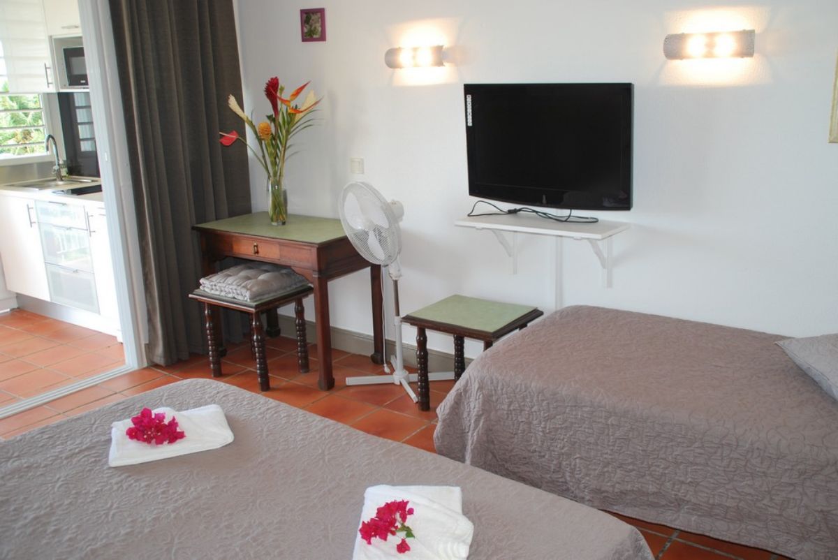 Surface: 34 m², à 5O m de la plage, entièrement rénové, vue mer 180°, au 1er étage d’une petite villa créole de 4 studios (voir photo).